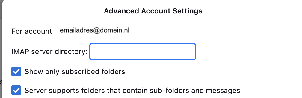 In sommige gevallen moet je daarna een instelling in je emailprogramma wijzigen om email folders weer zichtbaar te maken; het pad naar de hoofdmap. Daar staat nu: INBOX, maar deze moet leeg zijn.