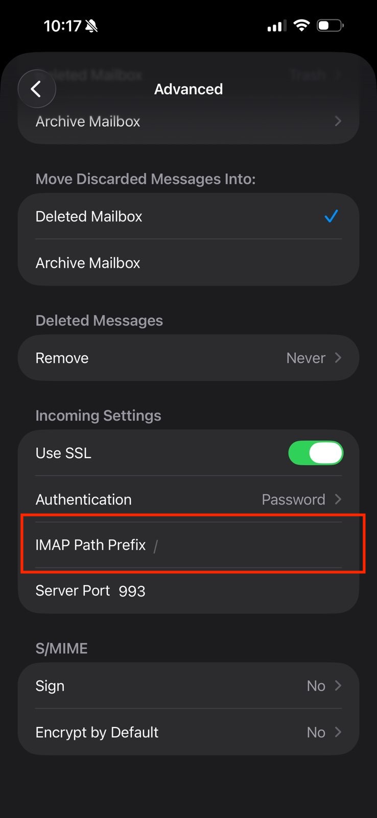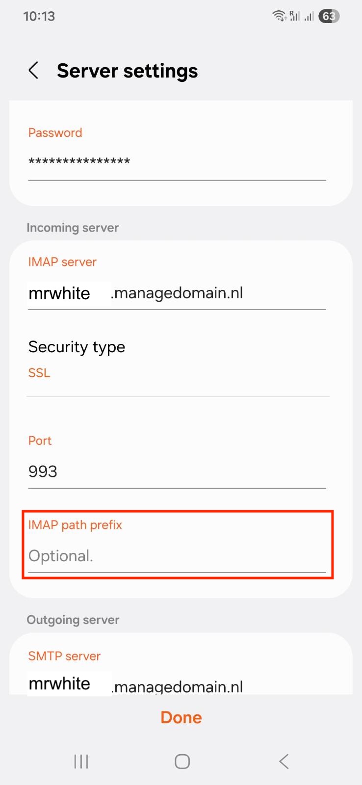 Bij Hoofdmap voor IMAP: verwijder de tekst INBOX